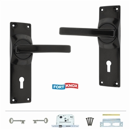 This 3-lever mortise lock provides enhanced security with a durable stainless steel faceplate and pressed steel handles in a sleek black finish.